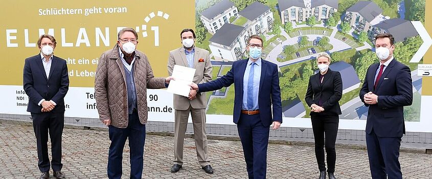 Landrat Thorsten Stolz (Vierter von links) überbrachte die Baugenehmigungen. Bürgermeister Matthias Möller (rechts) sowie die Investoren (von links) Till Marwede, Carsten Kulbe, G. Christopher Dürselen und Katharina Jürgensen freuen sich auf den Beginn der Bauarbeiten für Elmland 1. Foto: Bensing & Reith